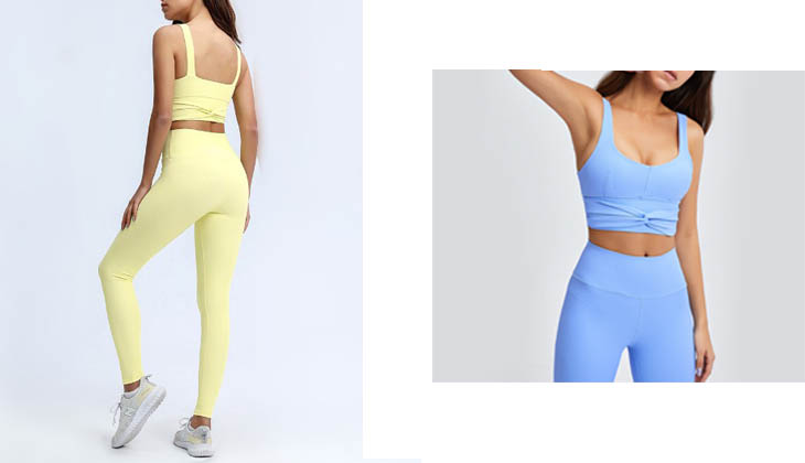 Gim wanita bergaris wanita baru kami menetapkan pakaian ---- Perincian simpul busur di tengah bra sukan dan reka bentuk pinggang tinggi pada legging menjadikan gaya ini cantik dan bernafas.